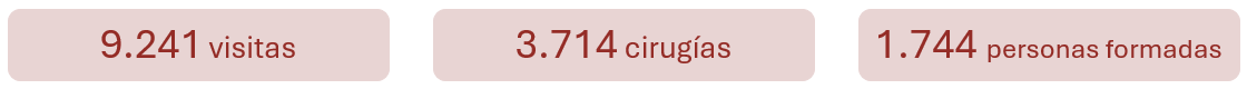 2016 - 2025Más información >Se ha dotado de una consulta oftalmológica completa y un taller de óptica. El quirófano es ya una realidad donde se realizan cirugías para evitar la ceguera evitable. Continuamos con la formación y el sistema de telemedicina.